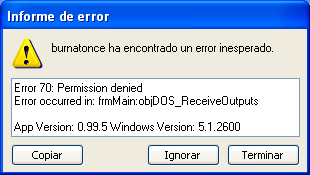 Hemos de reseñar que la aplicación "BurnAtOnce" es una aplicación que puede ser ejecutada correctamente por los usuarios que pertenecen al grupo "Administradores", tal es el caso del usuario "Profesor", pero que NO puede ser ejecutada por usuarios limitados, como es el caso del usuario "Alumno". Si iniciásemos una sesión de trabajo con el usuario "Alumno" e intentamos ejecutar la aplicación, se mostraría la siguiente ventana de error en la que pulsaríamos sobre el botón "Terminar", pues dicho usuario NO podrá ejecutar la aplicación en cuestión.