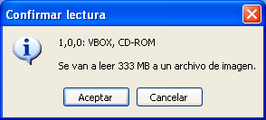 Tras ello se mostrará la siguiente ventana, en la que se nos informará de que va a ser creado el fichero de imagen correspondiente; pulsaremos en ella sobre el botón "Aceptar" para proceder.