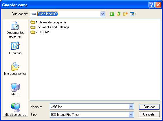 En la siguiente ventana podremos especificar el formato con el que será creado el fichero de imagen, así como su nombre y el lugar donde será almacenado; en nuestro caso en el desplegable "Tipo" seleccionaremos la opción "ISO Image File (*.iso)", en el desplegable "Guardar en" situaremos la imagen directamente en la unidad "C:" del equipo cliente, y finalmente en la caja de texto "Nombre" especificaremos el nombre del fichero que vamos a crear, en nuestro caso "W98.iso", tras lo cual pulsaremos sobre el botón "Guardar".