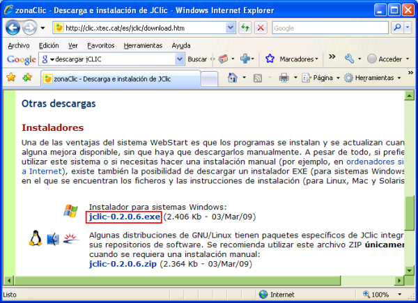 En el momento de elaborar este apartado existía en la red la posibilidad de descargar de modo gratuito una versión de la aplicación JClic para Windows y Linux desde la URL http://clic.xtec.cat/es/jclic/download.htm", concretamente la última versión disponible para Windows era "JClic 0.2.6.0", versión que procederemos a instalar en este apartado.