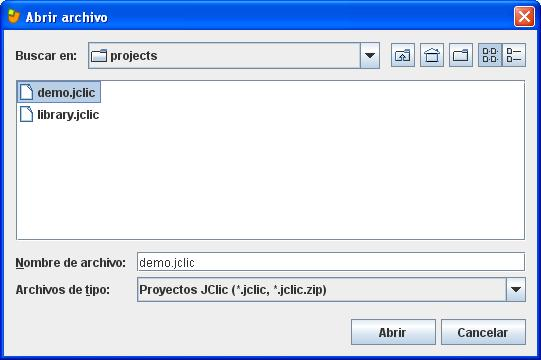 La aplicación nos llevará de modo automático a la carpeta "C:\Archivos de programa\JClic\projects", donde seleccionaremos el fichero "demo.jclic", tras lo cual pulsaremos sobre el botón "Abrir".