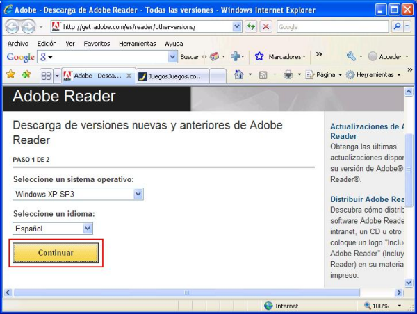 En nuestro caso instalaremos el lector PDF "Adobe Acrobat Reader", pues en el momento de desarrollar este apartado existía en la red la posibilidad de descargar de modo gratuito una versión del citado producto para Windows y Linux desde la URL "http://get.adobe.com/es/reader/otherversions", concretamente para Windows la última versión disponible era "Adobe Acrobat Reader 9.10", versión que procederemos a instalar en este apartado.