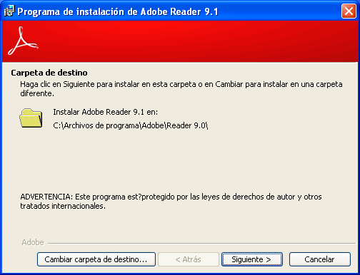 A continuación el asistente de instalación nos permitirá modificar la ruta de instalación del producto, si ese fuera nuestro interés, si bien en nuestro caso daremos por válida la ruta ofertada por defecto por el asistente, y pulsaremos en la ventana de la imagen inferior directamente sobre el botón "Siguiente".