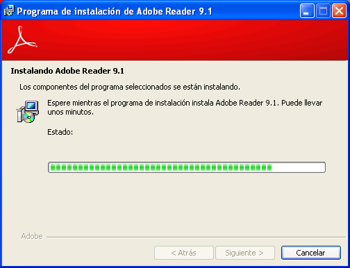 Así pues autenticados en nuestro equipo cliente Windows XP Professional con las credenciales del usuario "Profesor", procederemos a copiar el fichero de instalación "AdbeRdr910_es_ES.exe" del producto "Adobe Acrobat Reader 9.10" en el Escritorio de dicho equipo, para posteriormente hacer doble clic sobre el mismo, pasando a ser mostrada la primera ventana del asistente de instalación, que procederá de modo automático a la descompresión del producto para su posterior instalación, tal y como vemos en la ventana de la siguiente imagen.
