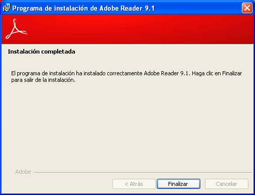 Una vez completado en su totalidad la instalación del lector PDF, será mostrada la siguiente ventana, en la cual pulsaremos directamente sobre el botón "Finalizar" para dar por concluido el proceso de instalación llevado a cabo.