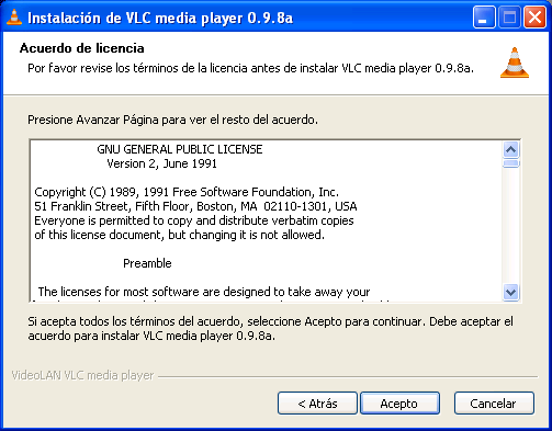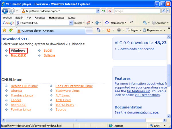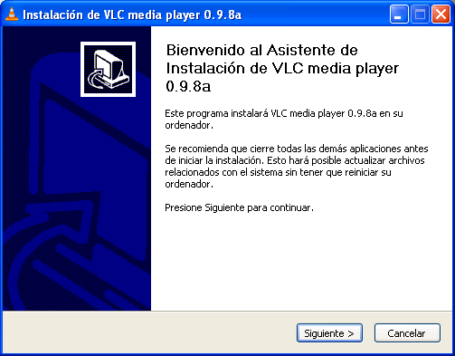 En el momento de elaborar este apartado existía en la red la posibilidad de descargar de modo gratuito una versión del reproductor multimedia VLC para Windows y Linux desde la URL "http://www.videolan.org/vlc/", concretamente para Windows la última versión disponible era "VLC 0.9.8", versión que procederemos a instalar en este apartado.