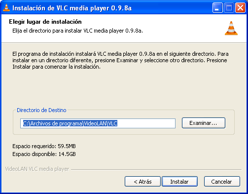 En la siguiente ventana podremos especificar la ruta donde deseamos instalar el producto, si bien en nuestro caso daremos por válida la ruta ofrecida por defecto por el asistente de instalación de VideoLAN VLC, pulsando directamente sobre el botón "Instalar" en dicha ventana.