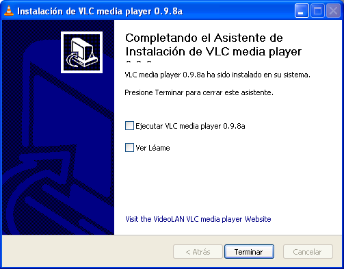 Una vez que el proceso de instalación concluya satisfactoriamente, se mostrará la siguiente ventana, en la cual desactivaremos la casilla "Ejecutar VLC media player 0.9.8a", pulsando tras ello sobre el botón "Terminar".