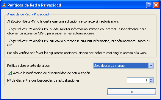 Una vez que la aplicación haya sido instalada, procederemos a comprobar su correcto funcionamiento haciendo doble clic sobre el acceso directo "VLC media player" ubicado en el Escritorio del equipo, pasando a ser mostrada la siguiente ventana de políticas de red y privacidad, en la que pulsaremos directamente sobre el botón "OK".