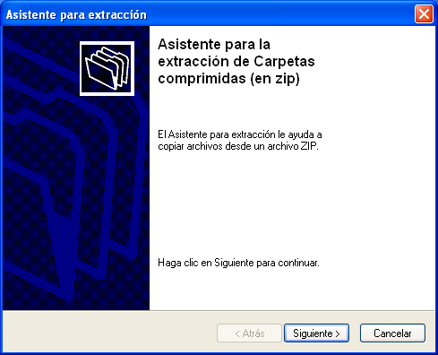 Así pues autenticados en nuestro equipo cliente Windows XP Professional con las credenciales del usuario "Profesor", procederemos a copiar el fichero de instalación "wink20-1060.zip" de "Wink 2.0" en el Escritorio de dicho equipo, para posteriormente pulsar sobre el mismo con el botón derecho del ratón para elegir la opción "Extraer todo" en el desplegable mostrado como resultado de dicha acción, momento en el que se nos presentará la siguiente ventana de descompresión del fichero reseñado, en la que pulsaremos directamente sobre el botón "Siguiente".