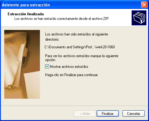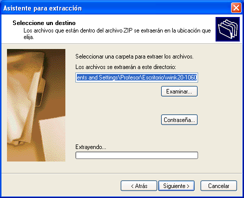 A continuación el asistente de descompresión nos permitirá especificar la ruta donde será descomprimido el fichero "wink20-1060.zip", dando por válida en nuestro caso la ruta propuesta por defecto por dicho asistente, y pulsando en la ventana de la imagen inferior directamente sobre el botón "Siguiente".