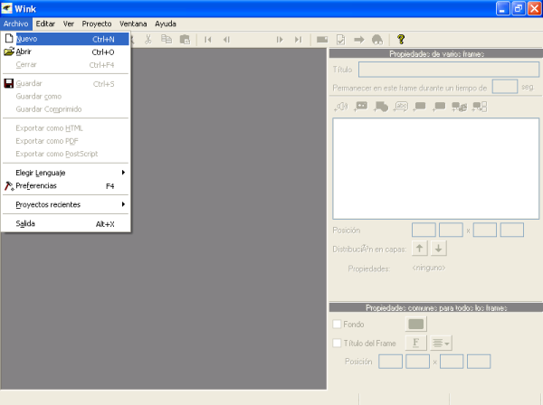 Si deseáramos comprobar que el capturador de pantallas Wink ha quedado correctamente instalado en nuestro equipo, podríamos ejecutar "Inicio ► Todos los programas ► Debugmode ► Wink ► Wink", pasando a ser mostrada como resultado de dicha acción la siguiente ventana, en la que como vemos la aplicación tiene configurados sus menús en inglés, luego procederemos a cambiar el idioma de la aplicación a español, pulsando para ello sobre la opción "File" del menú principal, y en el desplegable mostrado seleccionando "Choose Language", para posteriormente elegir el idioma "Spanish", tal y como vemos en la imagen siguiente.