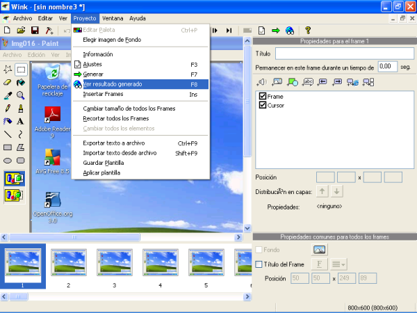 En ese instante se abre la ventana principal de la aplicación Wink, con todos los fotogramas que la aplicación ha ido capturado a lo largo del periodo comprendido entre el comienzo y el final de la captura, para componer con ellos la secuencia de vídeo correspondiente, para lo cual pulsaremos en dicha ventana sobre la opción "Proyecto", y posteriormente sobre "Ver resultado generado" en el desplegable asociado a dicha opción, tal y como vemos en la ventana de la imagen inferior.