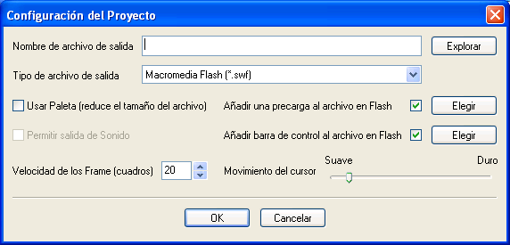 De vuelta a la ventana de configuración del proyecto, en la caja de texto correspondiente a "Nombre de archivo de salida", deberá mostrase la cadena de texto correspondiente a la ruta "C:\Prueba.swf", tal y como vemos en la imagen siguiente, momento en el que pulsaremos sobre el botón "OK" para continuar el proceso de configuración del nuevo vídeo que estamos creando.