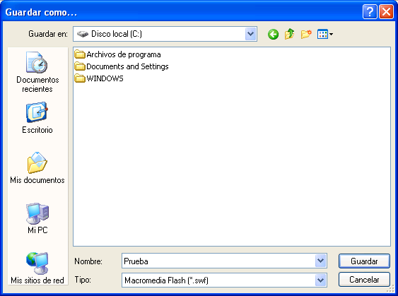 En la ventana mostrada como resultado de la acción anterior, navegaremos en el desplegable "Guardar en" hasta la unidad "C:" de nuestro equipo, para almacenar en dicha ubicación un fichero de nombre "Prueba" en formato "swf", de modo que cuando dicha ventana presente el aspecto mostrado en la imagen inferior, pulsaremos en ella sobre el botón "Guardar".