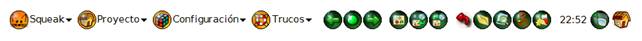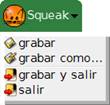 En lo que llamamos el panel de Squeak, la barra de herramientas situada en la parte superior del Mundo, encontramos unas pocas categorías de acciones situadas a la izquierda del mismo que nos permitirán acceder a las principales funciones de Squeak.