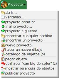 El menú Proyecto añade a las opciones del modo inicial, las entradas abrir... y ventanas... Ambas dan accesos a prestaciones complejas de Squeak. La primera, abrir..., sirve para abrir diferentes herramientas del programa, y la segunda (ventanas...) proporciona acceso a todo tipo de ventanas.