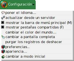 Configuración aparece con tres nuevas opciones: purgar los registros de deshacer, que elimina del disco todo los cambios deshechos; preferencias..., que abre un panel nos permite cambiar muchas configuraciones del programa, y apariencia..., que abre un panel para modificar la apariencia del mundo.