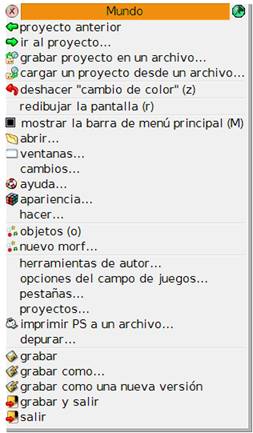 El Menú del Mundo es la entrada general a toda la funcionalidad de Squeak. En él se reproducen todas las opciones de las distintas categorías del panel y se añaden gran cantidad de herramientas que permiten explorar la potencialidad de Squeak.