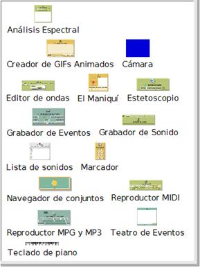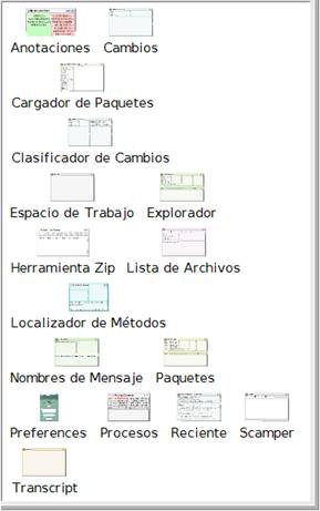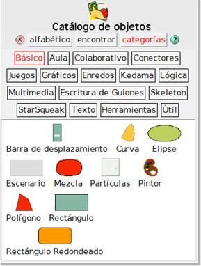 A continuación se resumen las características de los objetos de Squeak, en modo inicial, agrupados por categorías, tal y como se encuentran en el Catálogo de Objetos.