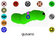 Cambiaremos el nombre de esta copia de la primera animación por el de gusano y, sobre él construiremos el guión de la animación. El objetivo de este guión consiste en que el foco del Contenedor (el objeto seleccionado en el contenedor) cambie secuencialmente; y que el objeto gusano “se parezca” al objeto que tiene el foco del Contenedor, es decir, que aparece seleccionado en ese momento dentro del Contenedor.