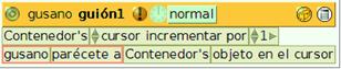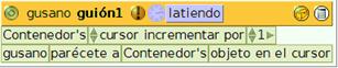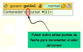 Para que el objeto seleccionado en el interior del Contenedor cambie secuencialmente, pulsaremos sobre las puntas de flecha que preceden a cursor hasta que la anterior expresión se lea Contenedor's cursor incrementar por 1.00.