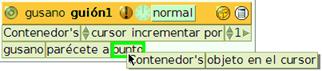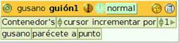 A continuación, abrimos el Visor del Contenedor y, desde la categoría contenedor, arrastramos hasta el guión vacío del objeto gusano la expresión Contenedor cursor <- 1.00, pulsando para ello sobre la flecha de asignación (verde sobre fondo amarillo).
