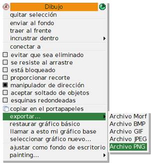 La exportación de archivos gráficos con Squeak es bastante sencilla. Consiste en activar el halo del objeto que se desea exportar, pulsar sobre el botón Menú (rojo) del objeto y seleccionar la opción de formato por la que se opte.