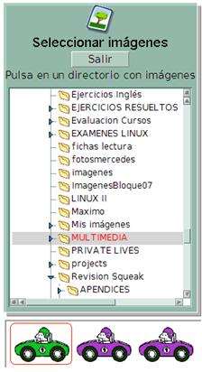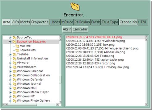 - Utilizando la herramienta Importar archivos, que encontramos como botón en el panel de Squeak, localizando el directorio en el que guardamos las imágenes y pulsando sobre el botón Arte.