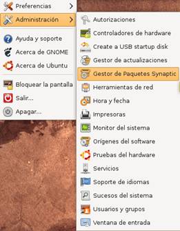 2. Arrancar Synaptic: Pulsar sobre el panel de Linux Ubuntu Sistema > Administración > Gestor de Paquetes Synaptic.