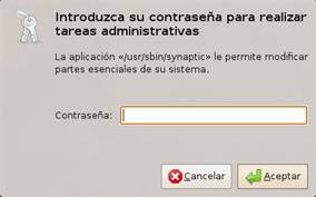 Puesto que la gestión de paquetes es una tarea reservada al Administrador del sistema, el sistema pedirá la contraseña para poder acceder a Synaptic.