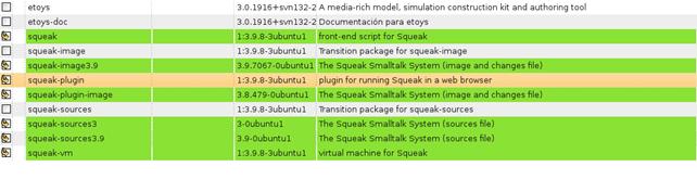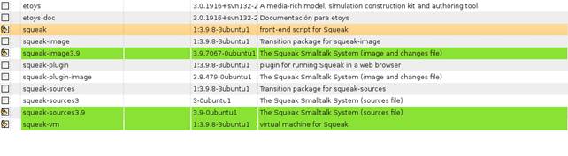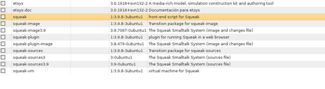 Como resultado de la búsqueda, en la ventana principal de Synaptic se mostrará una relación de paquetes en la que deberemos localizar squeak y marcarlo para su instalación.