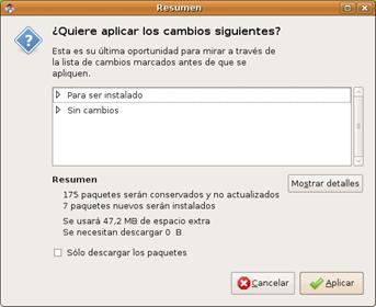Synaptic mostrará un resumen de los paquetes marcados para instalación y solicitará confirmación.