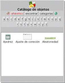 - alfabético: Al pulsar sobre esta opción accederemos a una botonera que nos permite el acceso a los distintos tipos de objetos agrupados por orden alfabético. Haciendo clic sobre cualquiera de las letras se podrán ver los iconos de todos los objetos cuyos nombres comienzan por la letra indicada.
