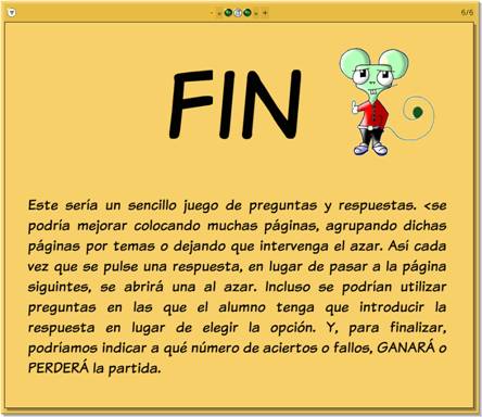 Para concluir el juego de preguntas y respuestas, incluiremos una página final, cambiamos su formato e introducimos dos objetos de Texto y la imagen de Ratonete (ratonete_transparente.gif) que podremos arrastrar y soltar desde la carpeta Recursos > imagenes_raton del CD del material. Por último, modificaremos el contenido de los objetos de texto para que incluyan los textos de la imagen Página final.