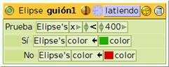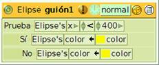 Cambiamos el número 5 por el 400, y desde la categoría color, arrastramos Elipse's color en el Sí de la prueba. Repetimos el proceso y colocamos Elipse's color en el No de la prueba.
