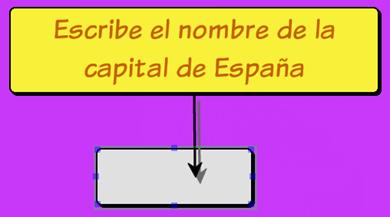 En la parte superior aparecen tres Textos Adornados que obtendremos de la pestaña Provisiones. Modificando sus dimensiones, color y texto obtendremos dos formas rectangulares, la primera con el rótulo La unidad de prueba y la segunda con la frase a modo de pregunta: Escribe el nombre de la capital de España. El tercer rectángulo se ha dejado vacío para recibir la respuesta.