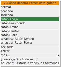 Sólo queda por modificar el valor del inicio del guión que, por defecto, aparece en estado normal. Pulsando sobre la palabra normal del guión obtendremos el menú ¿Cuándo debería ejecutar este guión?, del que seleccionaremos la opción ratón Abajo.