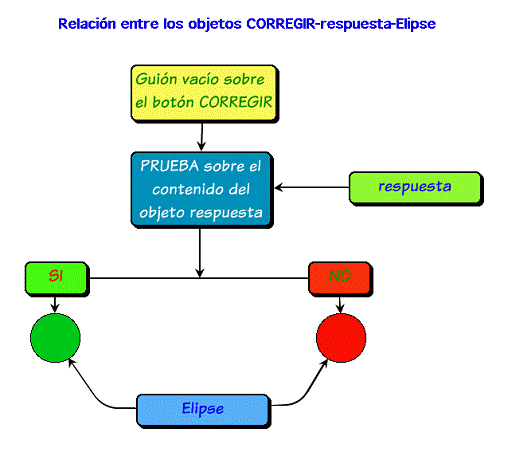 Resumiendo, el guión se construye sobre el botón CORREGIR y se nutre de acciones correspondientes a los objetos respuesta y Elipse, como se muestra en el Esquema representativo de las relaciones establecidas entre los tres objetos (CORREGIR, respuesta y Elipse).