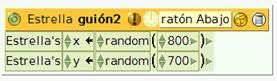 Para ello, desde el icono situado en el editor de guiones arrastraremos hasta los respectivos valores de las coordenadas x e y, sendos mosaicos de random 5 que sustituirán los valores iniciales.