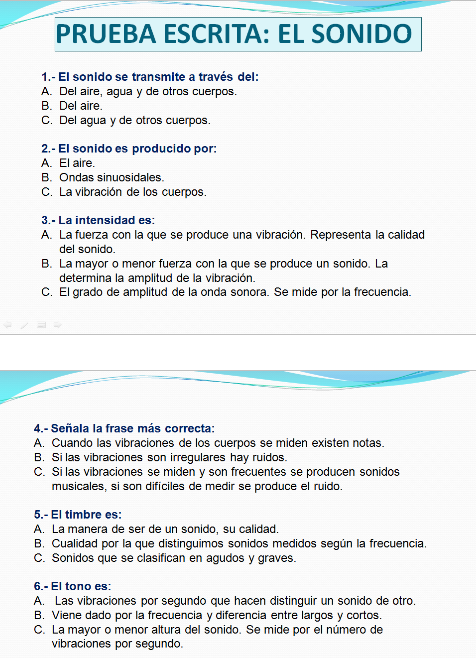 Nuestros alumnos/as deberán tachar la respuesta adecuada de esta prueba tipo test en la plantilla que les repartiremos. Posteriormente las recogeremos y nuestros alumnos corregirán en la PDI los resultados de las preguntas explicando cada una de ellas.