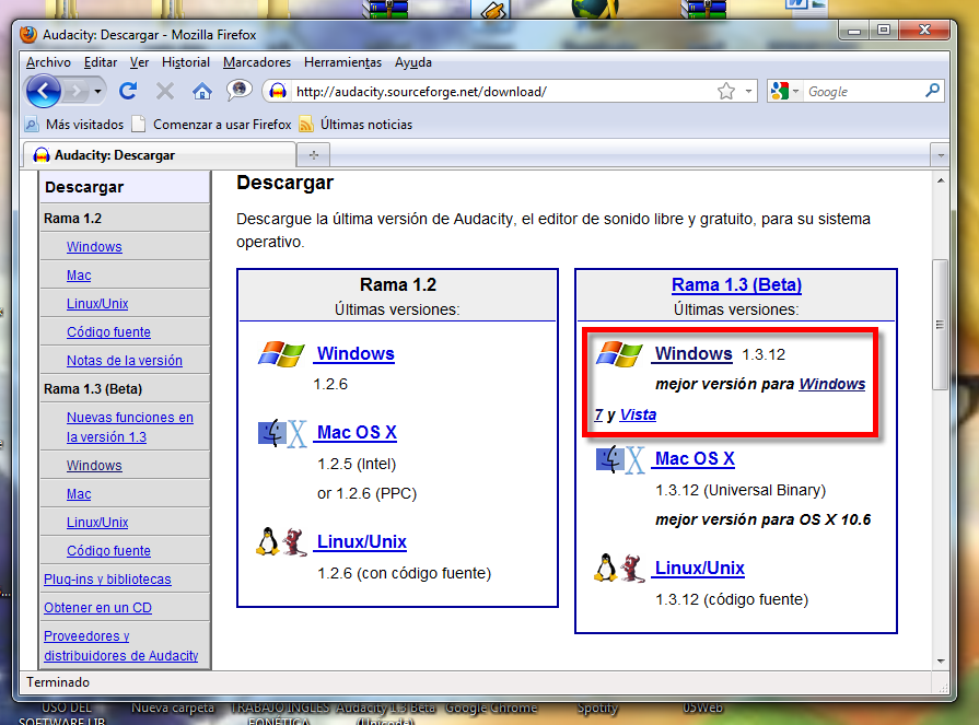 Indicaremos a nuestros alumnos/as que se descarguen la aplicación apropiada a su equipo desde el enlace situado en la caja "Rama 1.3 (Beta) últimas versiones. Para que no haya confusión de la versión a utilizar, seleccionaremos la herramienta cuadrado de la PDI y enmarcaremos dicha versión en color rojo.