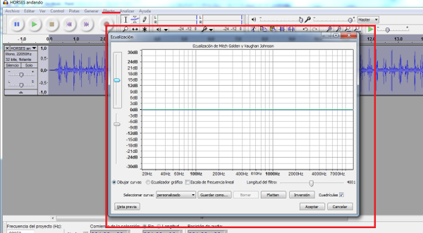- Ecualización. Ajusta o reduce las frecuencias extrañas del fragmento elegido.