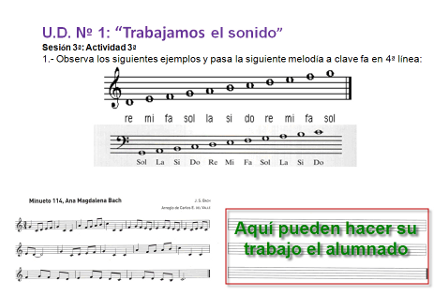 En esta otra ficha de trabajo vamos a poner en práctica la teoría y lo que nuestros alumnos han entendido con respecto a las notas musicales colocadas según la clave que se indique al comienzo del pentagrama, lo trabajarán nuestros alumnos/as desde su sitio en su ficha de trabajo y posteriormente irán saliendo a pasar las notas a clave de fa sobre la PDI (Actividad 3ª).
