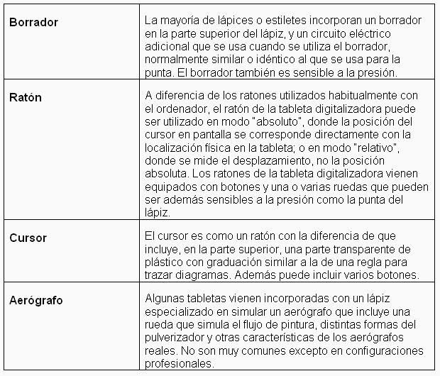 Las tabletas gráficas incluyen un lápiz o estilete imprescindible para interactuar, si bien pueden usarse accesorios adicionales como: