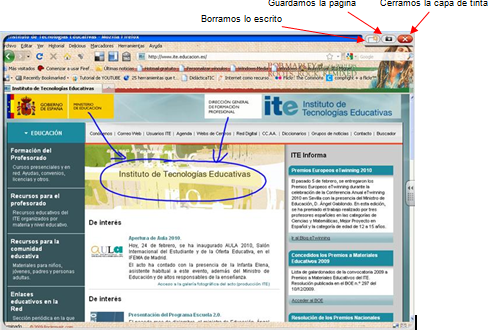 Observa que de forma automática se activa el software Notebook realizando una captura de la pantalla abierta con todas las notas realizadas. Al hacer la captura aparece un recuadro que debes arrastrar para seleccionar la zona que deseas capturar y guardar. Para hacer una captura de pantalla completa deberás hacer una única presión sobre la pantalla. También puedes restaurar las anotaciones realizadas, si por accidente has borrado las notas al cerrar la capa de tinta digital.