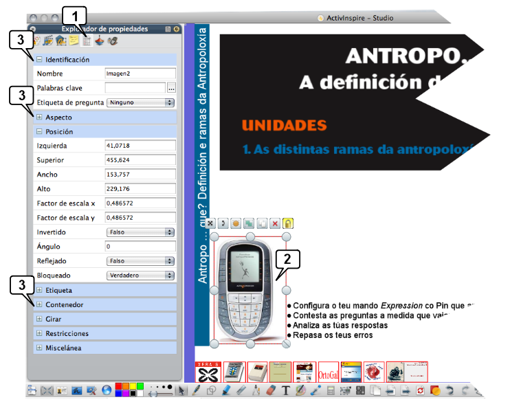 Todos los objetos incluidos en los rotafolios tienen unas propiedades tales como nombre, tamaño, posición,… este explorador concentra toda la información sobre todas ellas. Incluso podrás cambiarlas directamente en el explorador.