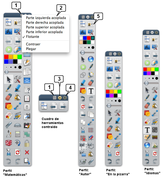 En la imagen anterior puedes ver cuatro perfiles que Inspire instala: Matemáticas, Autor (usado para diseñar rotafolios), En la pizarra (el adecuado para el aula) e Idiomas. Observa que tienes herramientas distintas. Puedes modificar cualquiera de ellos y guardarlo con un nombre nuevo.