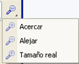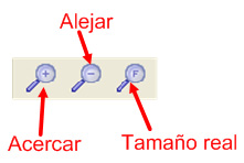 Con las opciones que se presentan el objeto seleccionado lo puedes acercar, alejar o ponerlo de nuevo a su tamaño real. Estas mismas opciones las tienes también en la Barra de Herramientas en los iconos que ves en la imagen siguiente:
